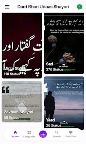 このアプリには、Jaun Elia、Mirza Ghalibなどの有名な詩人による作品を含むさまざまなウルドゥー詩が含まれています。ダード・シャヤリ、悲しい詩、またはベワファ・シャヤリをお探しの場合、このアプリにはすべて揃っています。